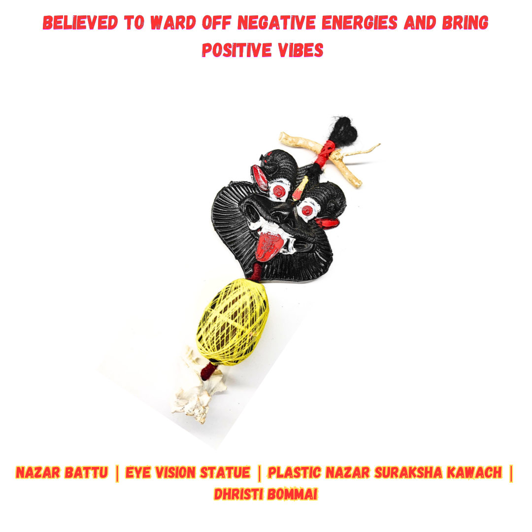 The Drishti Bommai Evil Eye Protector, an exquisite blend of tradition and modernity. This Nazar Battu serves not only as a stunning decorative piece but also as a powerful negative energy remover for home. Crafted from high-quality plastic, this kirtimukha for home adds cultural significance to your decor while safeguarding your environment. Perfect for hanging at your home entrance or adorning any wall, this stylish evil eye hanging provides both protection and charm